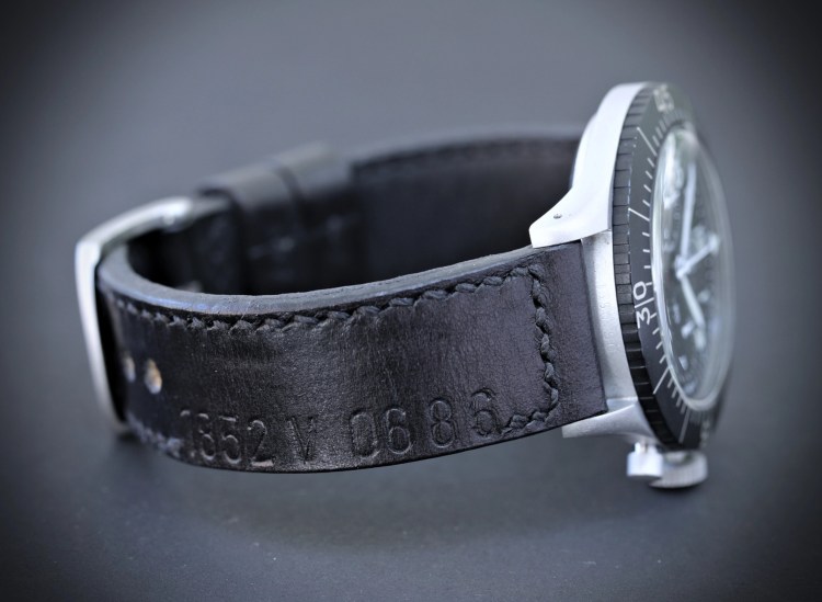 Passend zur Bundeswehruhr wurde das Band aus einem alten Bundeswehrgürtel mit originaler Versorgungsnummer gefertigt.