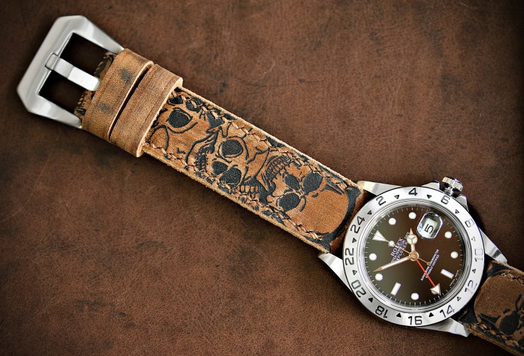 Das braune Skull-Band passt farblich perfekt zu dieser schwarzen Zenith Fliegeruhr.