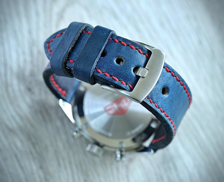 Passend zum Heuer-Schriftzug wurde an diesem Chrono ein blaues Rindslederband mit roter Naht montiert.