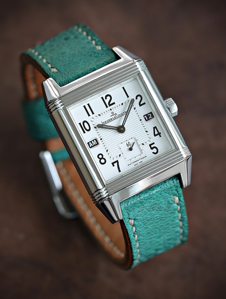 Diese klassische Jaeger-LeCoultre wird mit dem grünen Krötenbein-Strap zum auffälligen Unikat.