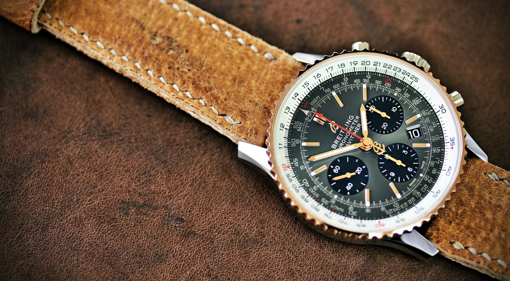 Das Schweinslederband aus einer alten Militärtasche macht diese Bi-Color Navitimer zum Einzelstück.
