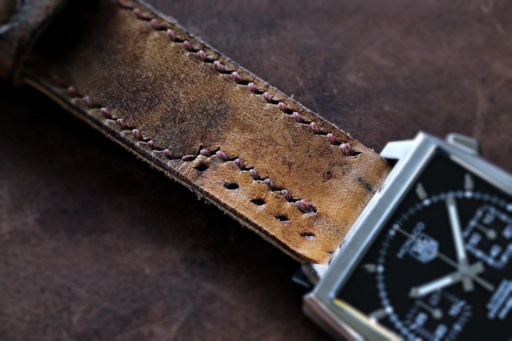Diese Heuer Monaco wurde mit einem Band ausgestattet, das aus einer alten Schweizer Militärtasche hergestellt wurde. Man kann noch die alten Nahtlöcher erkennen.