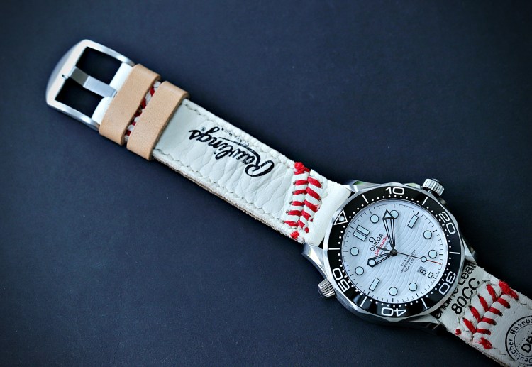 Dieses Band wurde aus einem Rawlings Baseball gefertigt und passt mit der roten Kontrastnaht perfekt zum Seamaster-Schriftzug.