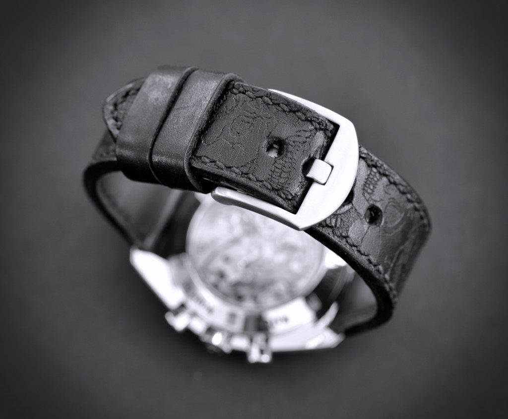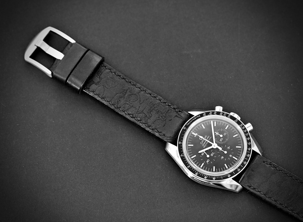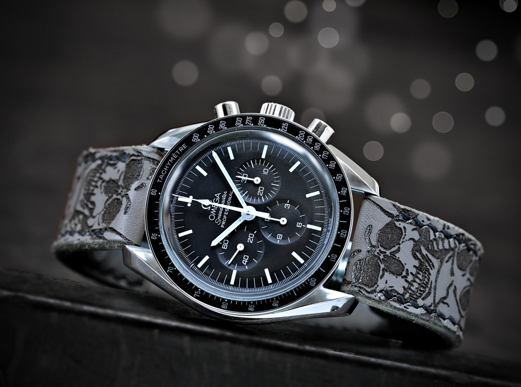 Schlicht auf den ersten Blick – BÖSE beim näheren Betrachten: Dieses schwarze Skullband wirkt sehr dezent an der Speedy und harmoniert perfekt mit dem schwarzen Zifferblatt.