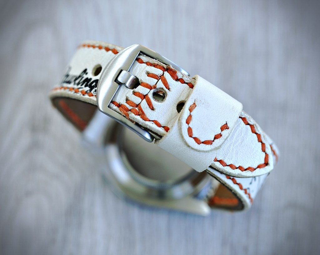 Mit diesem Baseballband ist farblich alles abgestimmt. Die orangen Nähte passen zum GMT-Zeiger, der schwarze Rawlings Schriftzug zu den restlichen Zeigern. Das weiße Leder harmoniert hervorragend mit dem weißen Zifferblatt. Eine auffallende und sportliche Kombination für den Sommer!