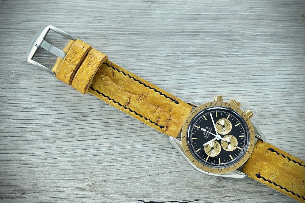 Ein Sondermodell der Speedmaster mit 18K Goldlünette schreit natürlich auch nach einem besonderem Band. In diesem Beispiel wurde ein goldfarbenes Störleder mit farblich abgestimmter Naht gewählt.