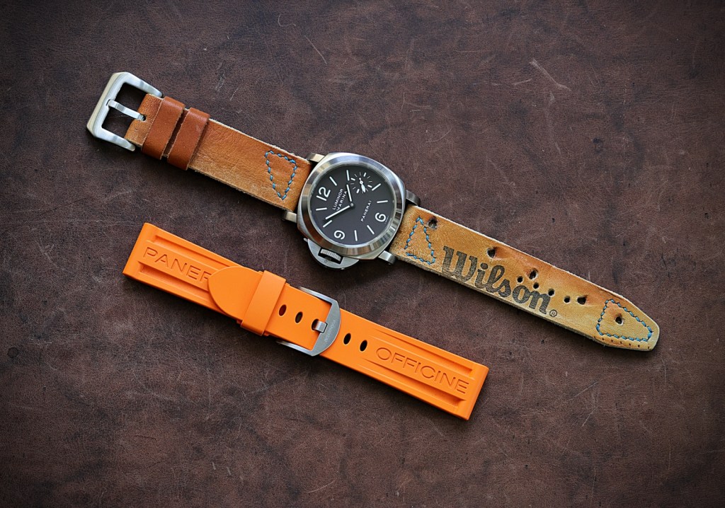 Mit diesem auffällig genähten Lederband aus einem alten Wilson Baseballhandschuh erhält die Panerai PAM 00117 Destro einen sportlichen Look.