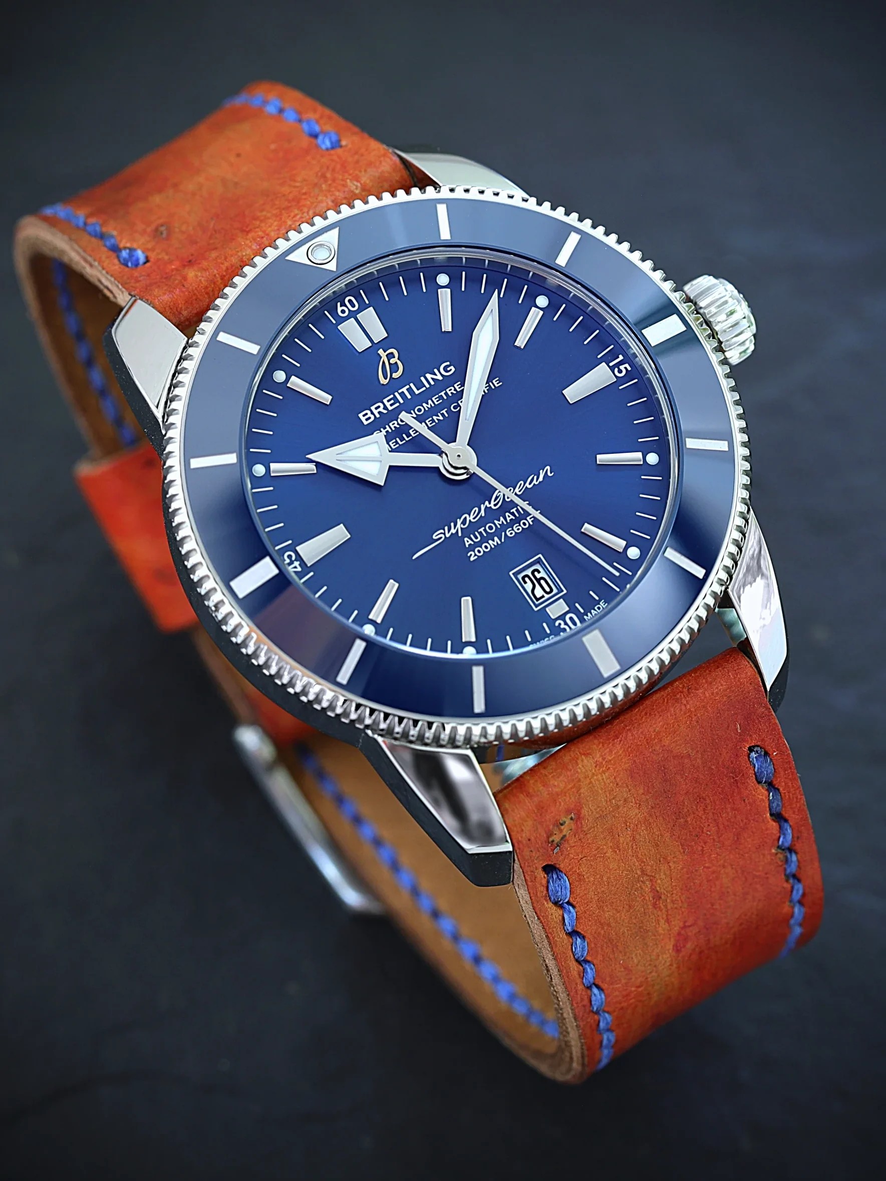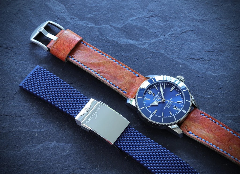 Auch eine Breitling Super Ocean muss nicht unbedingt ans Stahlband. V.a. wenn die Farben so schön harmonieren, darf die Uhr mit dem schönen blauen Zifferblatt auch gerne ans Störleder.