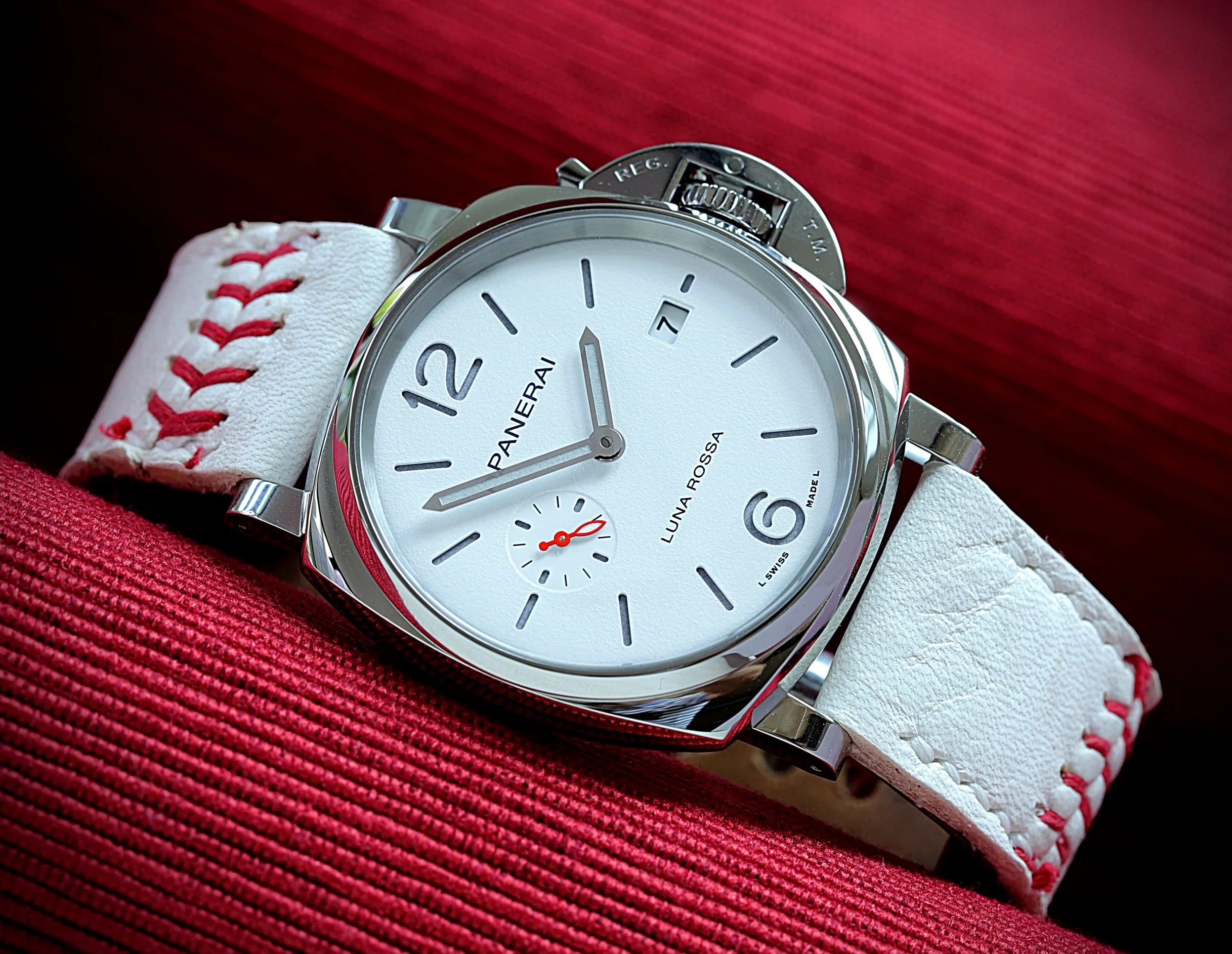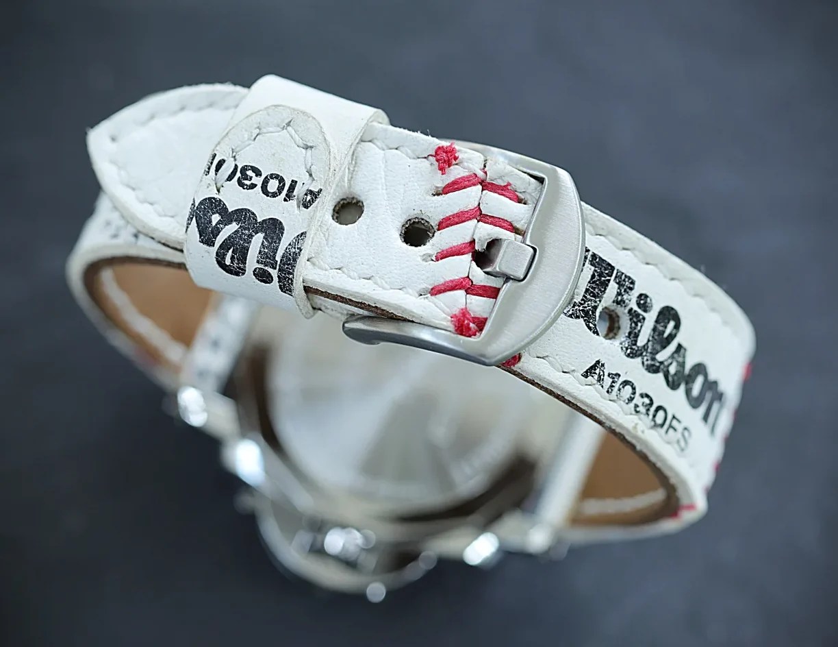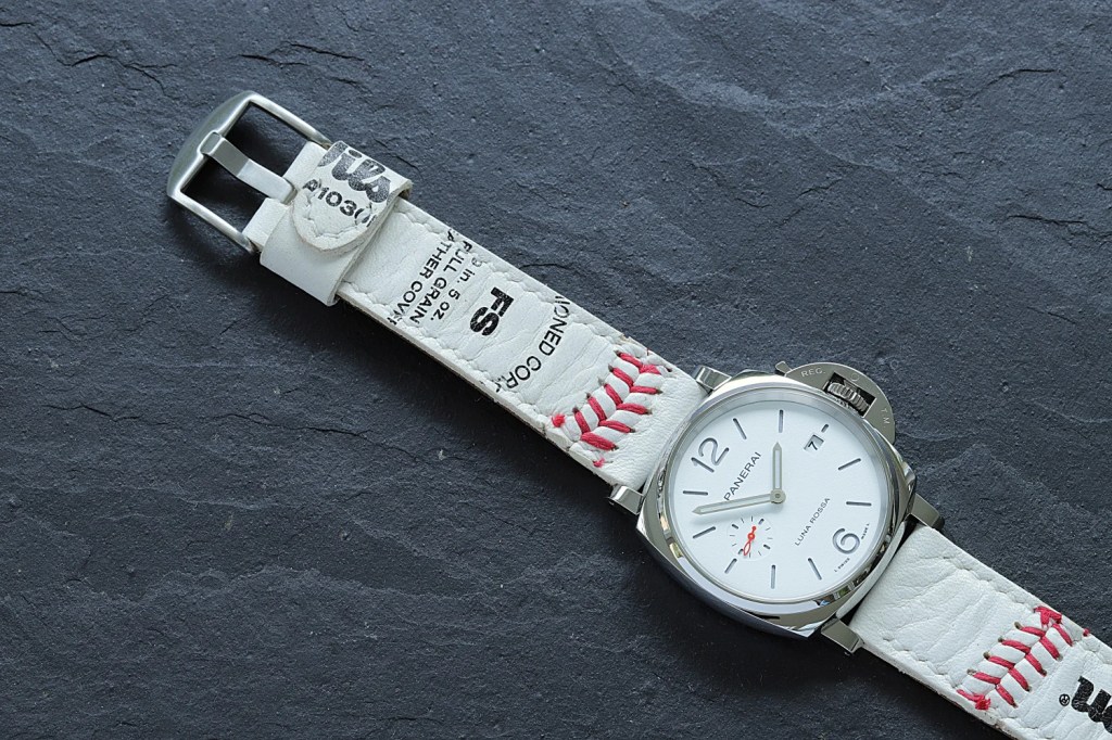Panerai Rot-Weiß! Das weiße Uhrenband aus einem Baseball-Ball harmoniert mit seiner originalen roten Baseballnaht perfekt mit der Panerai Luna Rossa.