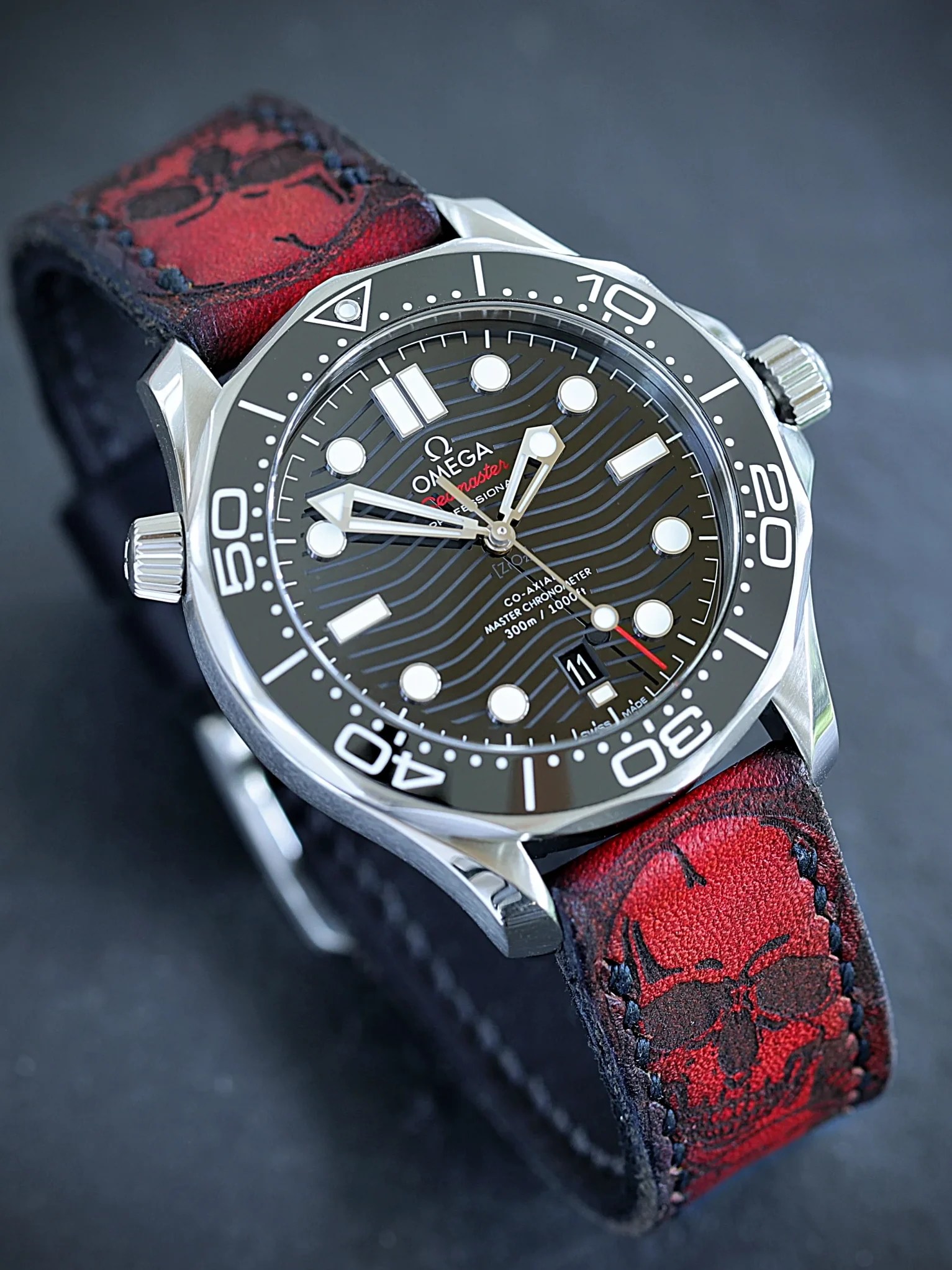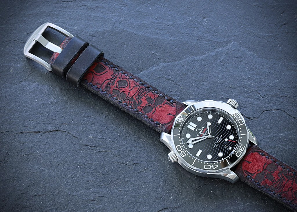 Farblich perfekt abgestimmt. Das rote Skullband mit schwarzer Naht greift die Farben dieser Seamaster sehr schön auf.