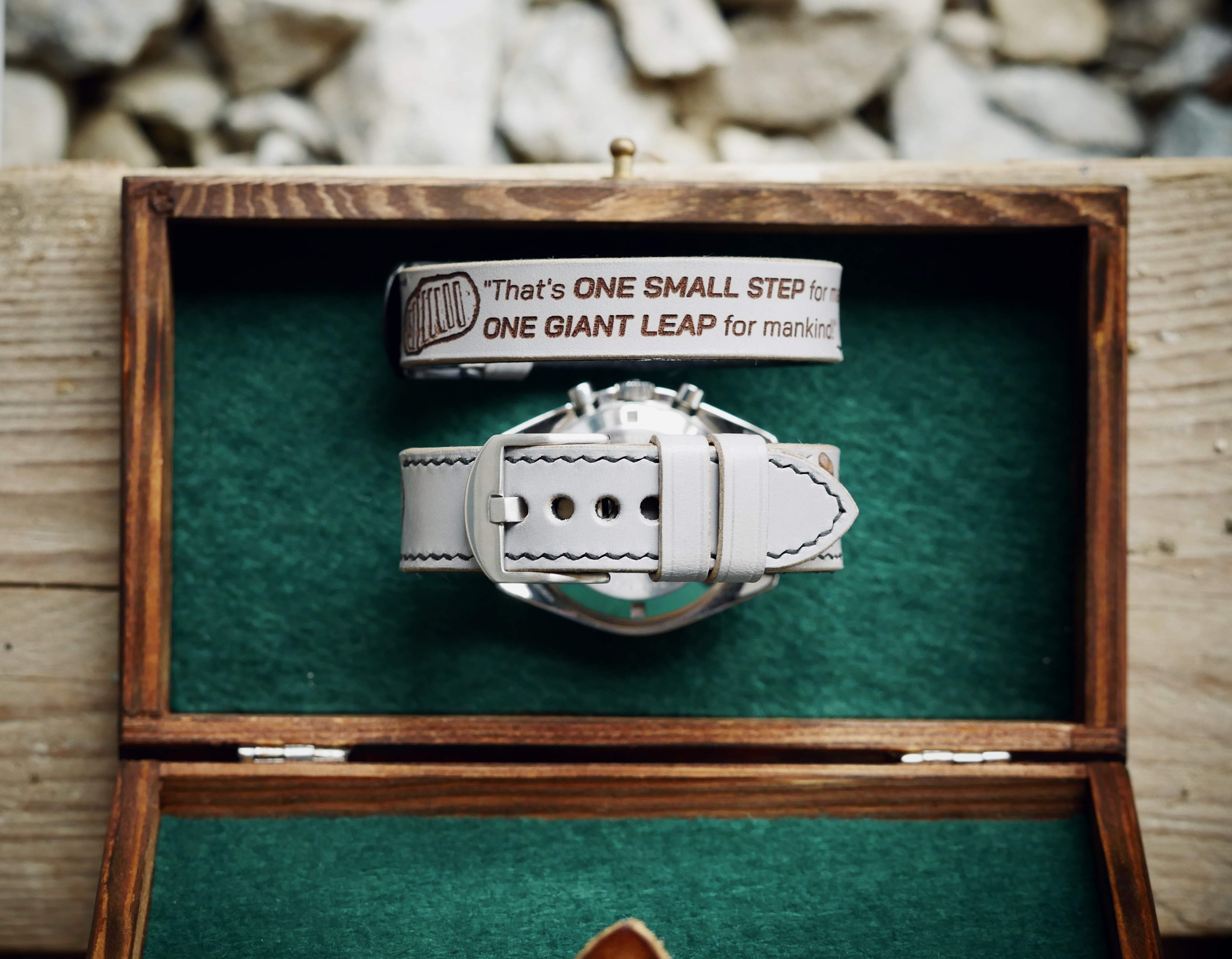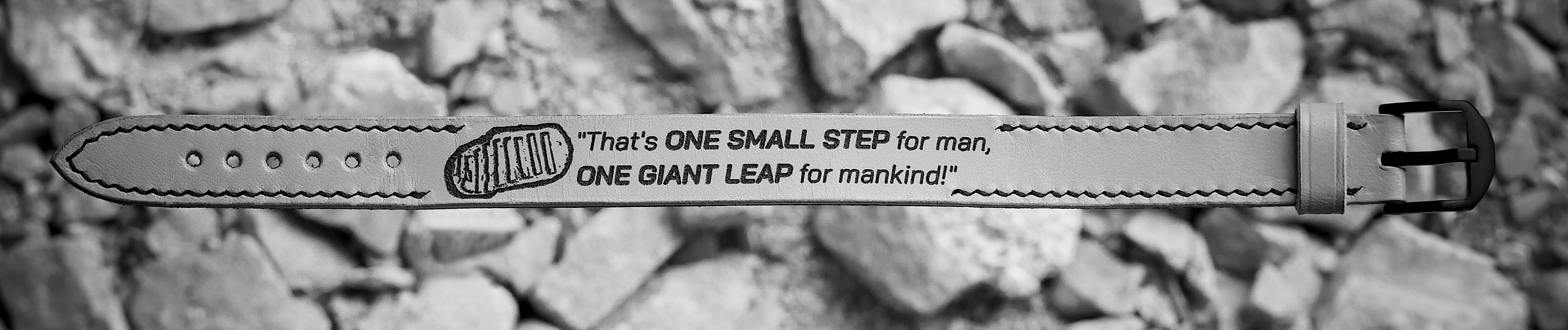 Das MOON-Band vereint traditionelle Handwerkskunst mit modernster Technik. Die Aufschrift wird mit einem CNC-Laser in die Lederhaut gebrannt, anschließend wird diese in Handarbeit zum Uhrenband verarbeitet. Wie jedes Band von CH-Vintage ist natürlich auch das MOON-Band handgenäht.